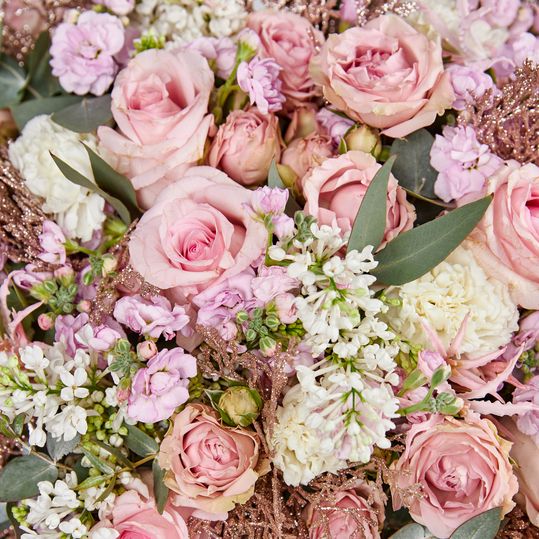 Ecuador rose, bush rose, matiolla, lilac, eucalyptus, carnation, nerine, decor, ribbon.